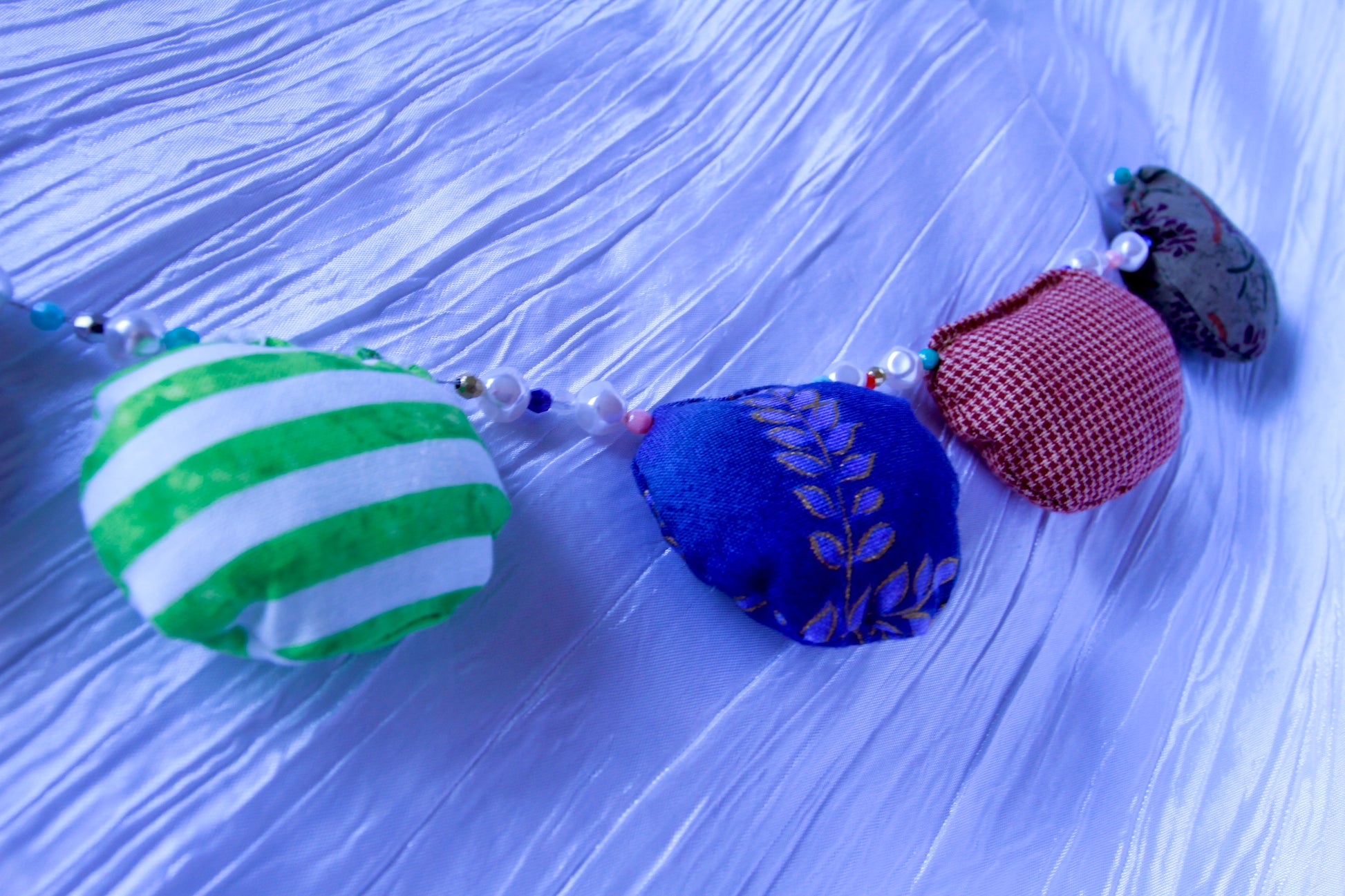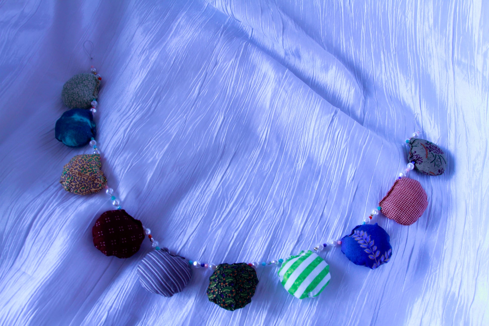 Colorful, recycled cotton, wall garland with beaded detail