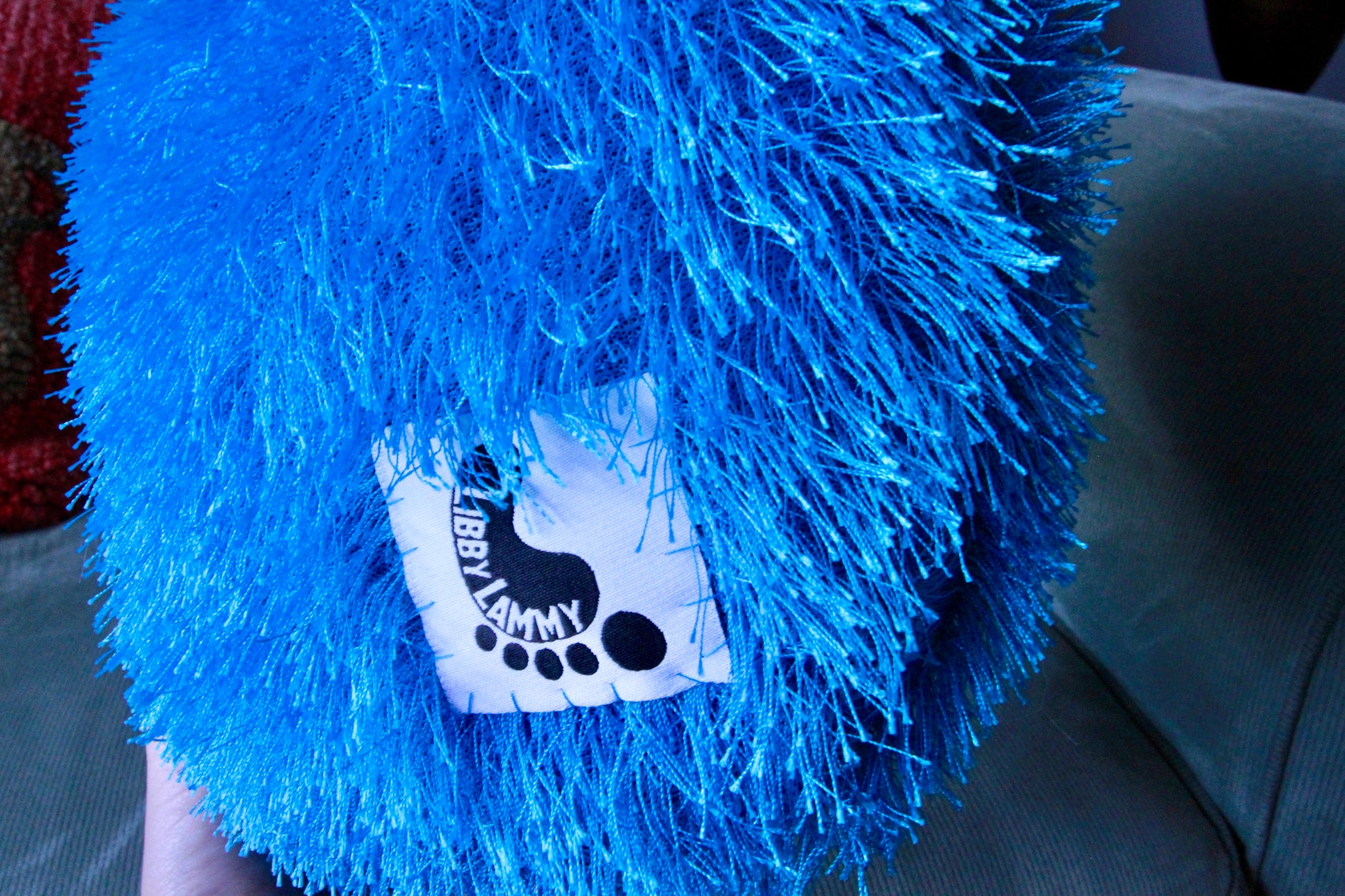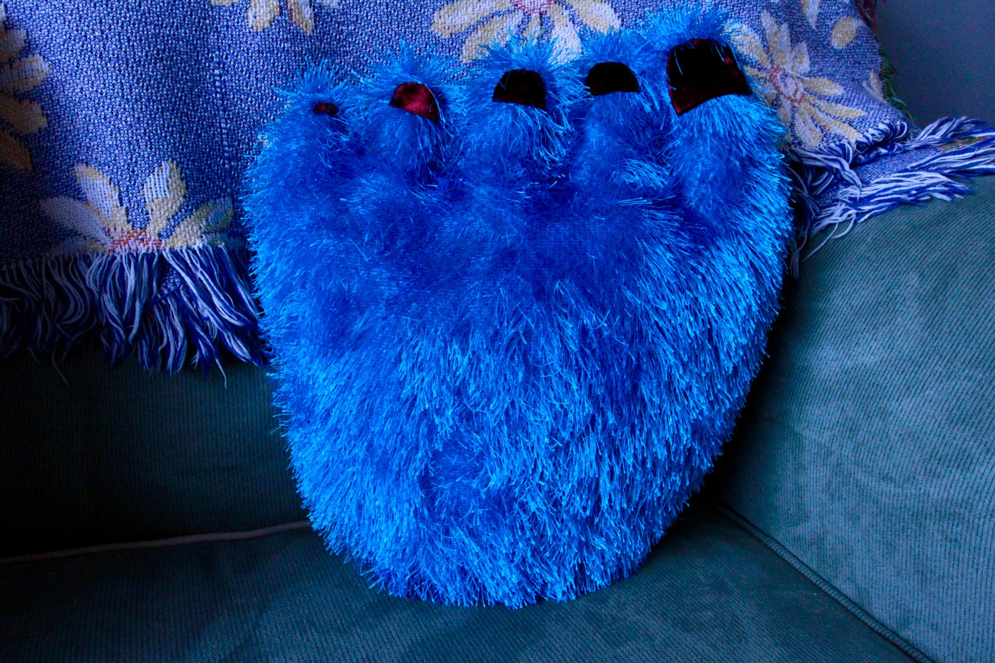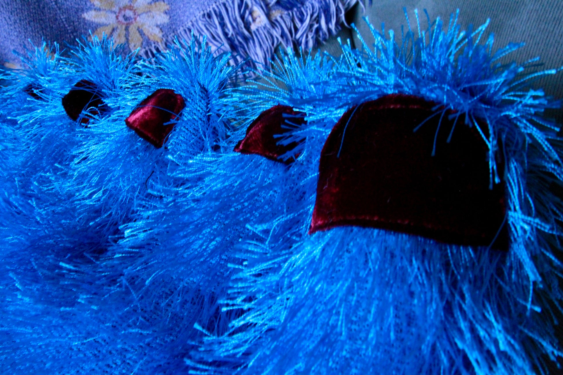 Medium, furry blue foot pillow with velvet maroon lace. Sure to brighten up your home and start a fun conversation with your guests.