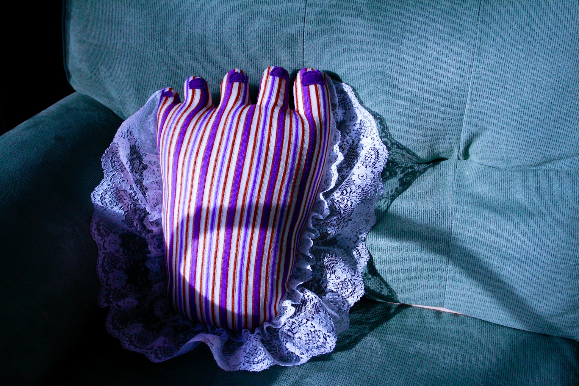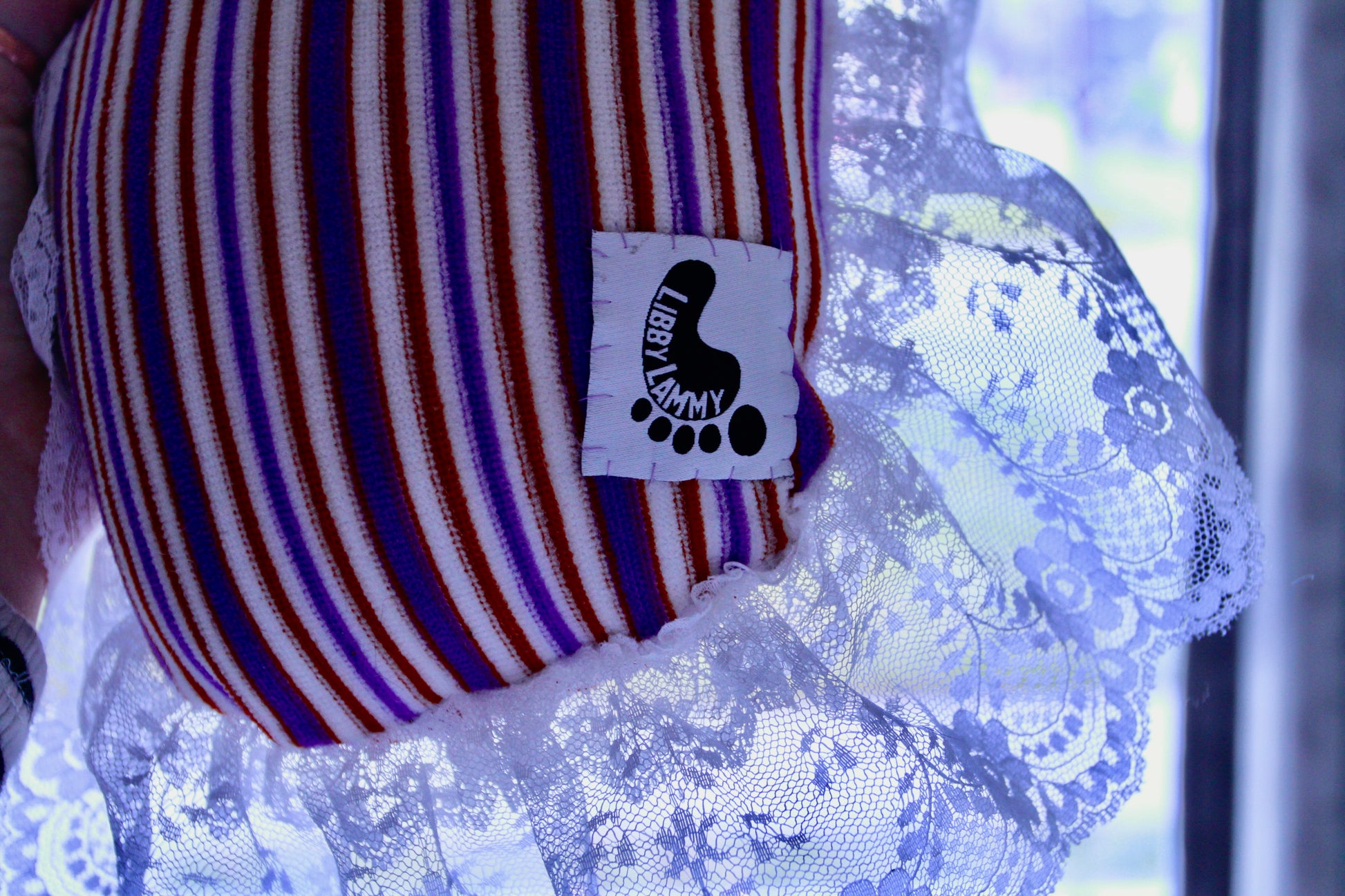 Medium, orange, purple, and white striped foot with purple toe nails and white lace trim. Sure to brighten up your home and start a fun conversation with your guests.