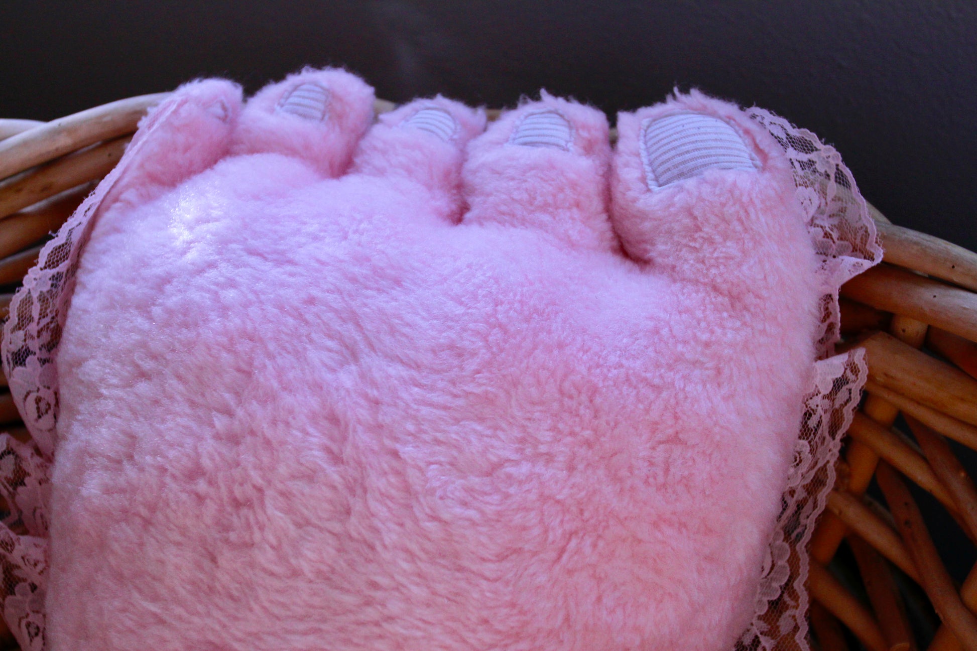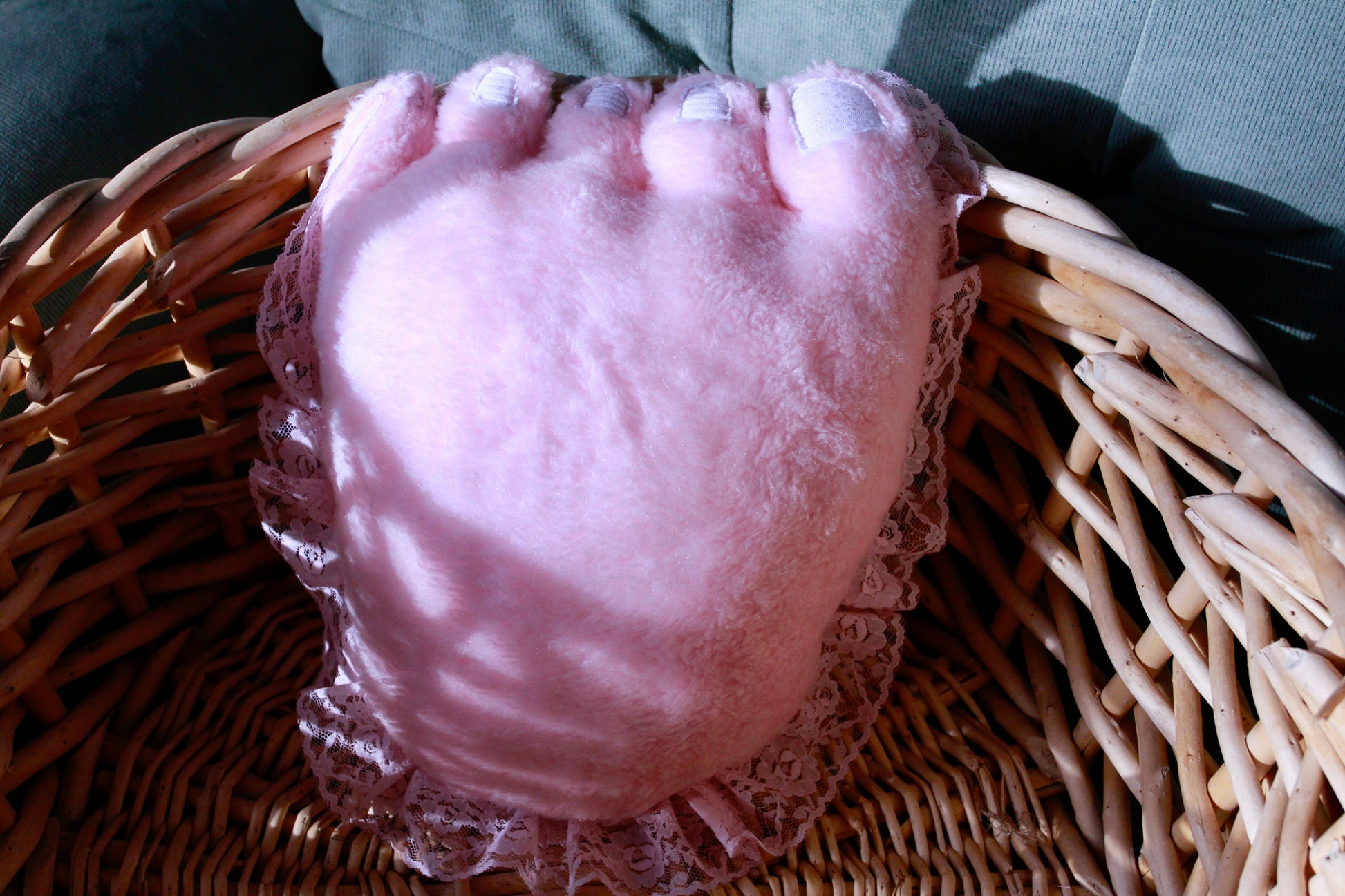 Medium, Fuzzy baby pink foot with white toe nails and pink lace trim. Sure to brighten up your home and start a fun conversation with your guests.