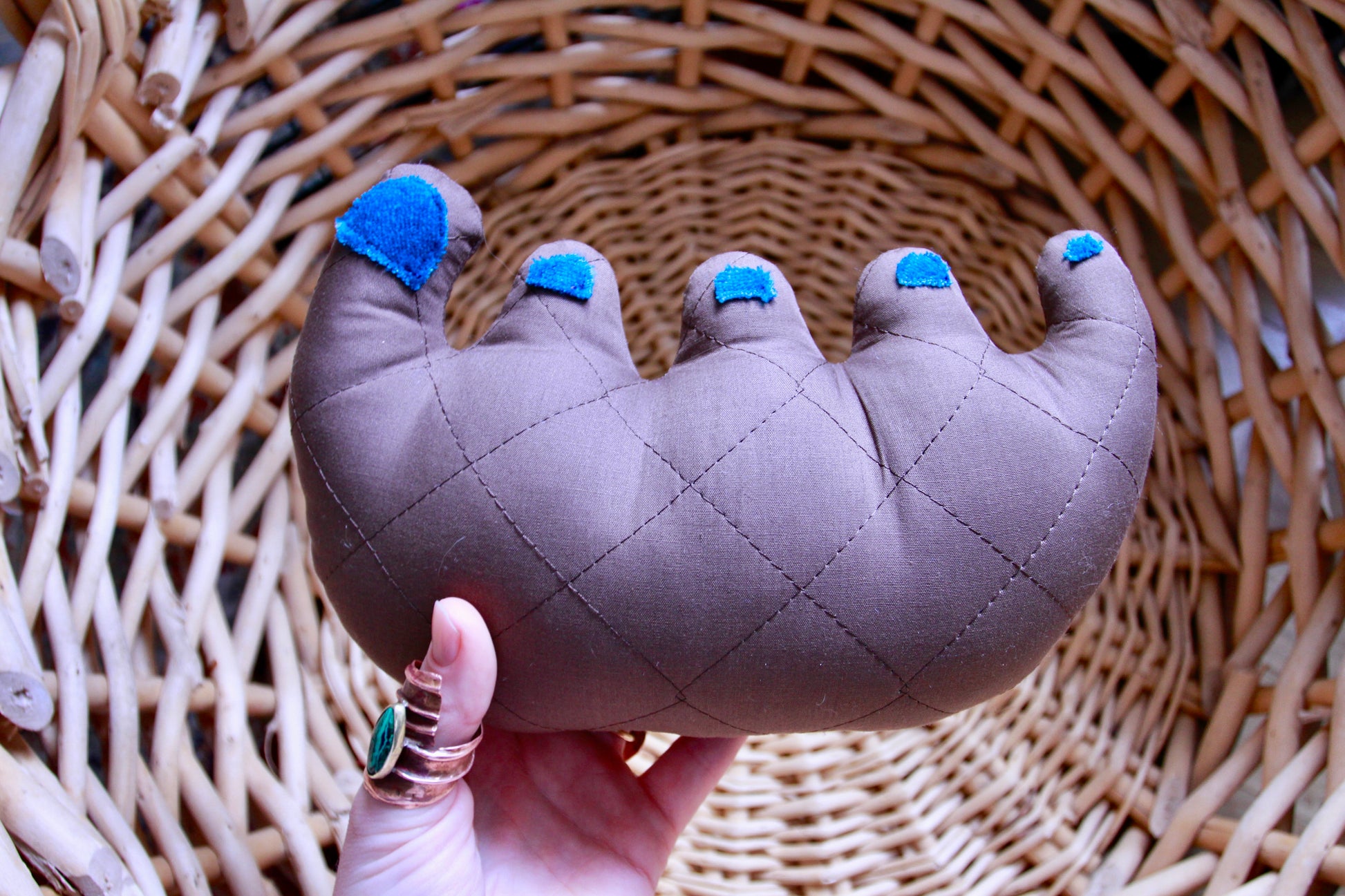 X-Small, quilted brown foot with vibrant blue toe nails. Sure to brighten up your home and start a fun conversation with your guests.