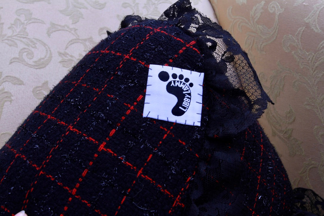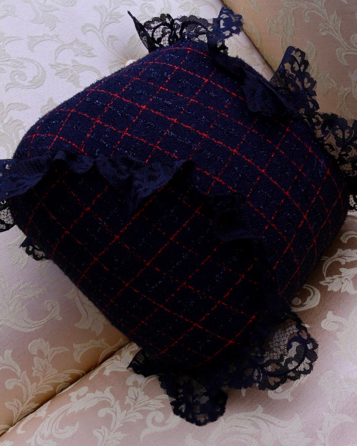 Black, Sparkle Plaid Mother of Pearl pillow with flowy black lace.