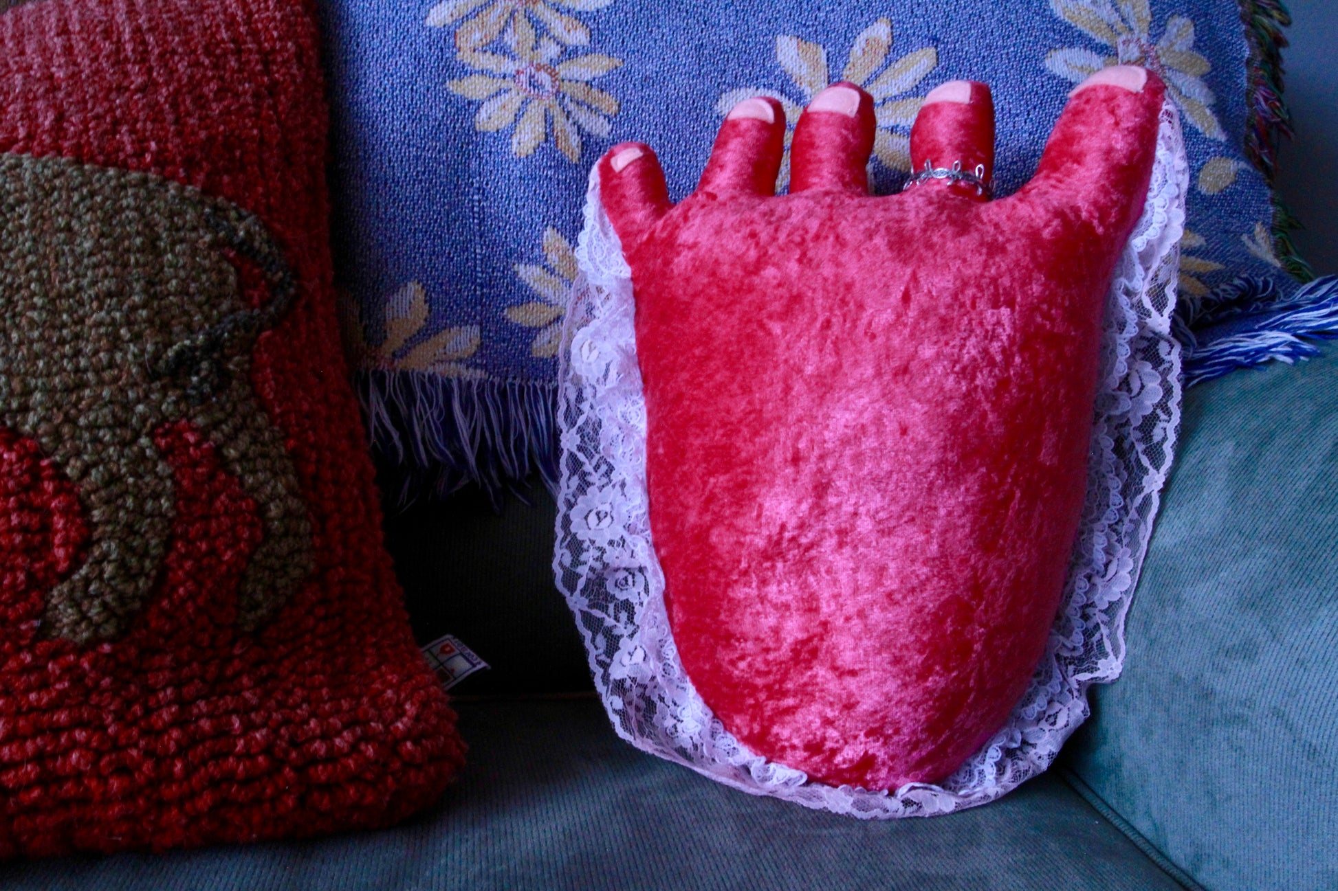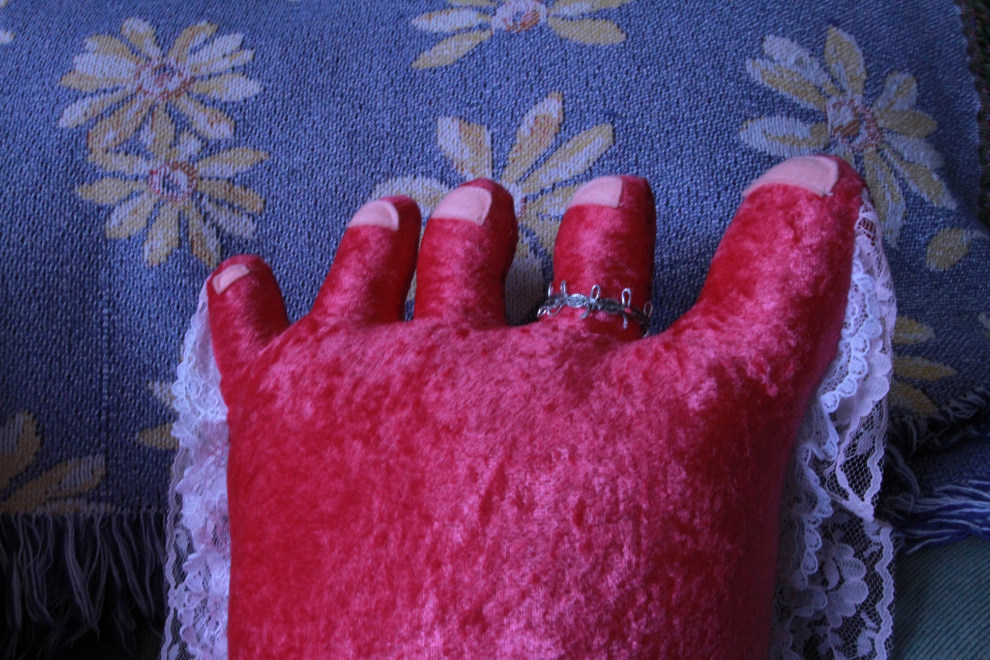 Medium, velvet, hot pink foot pillow with light pink toe nails and a toe ring included. Sure to brighten up your home and start a fun conversation with your guests.