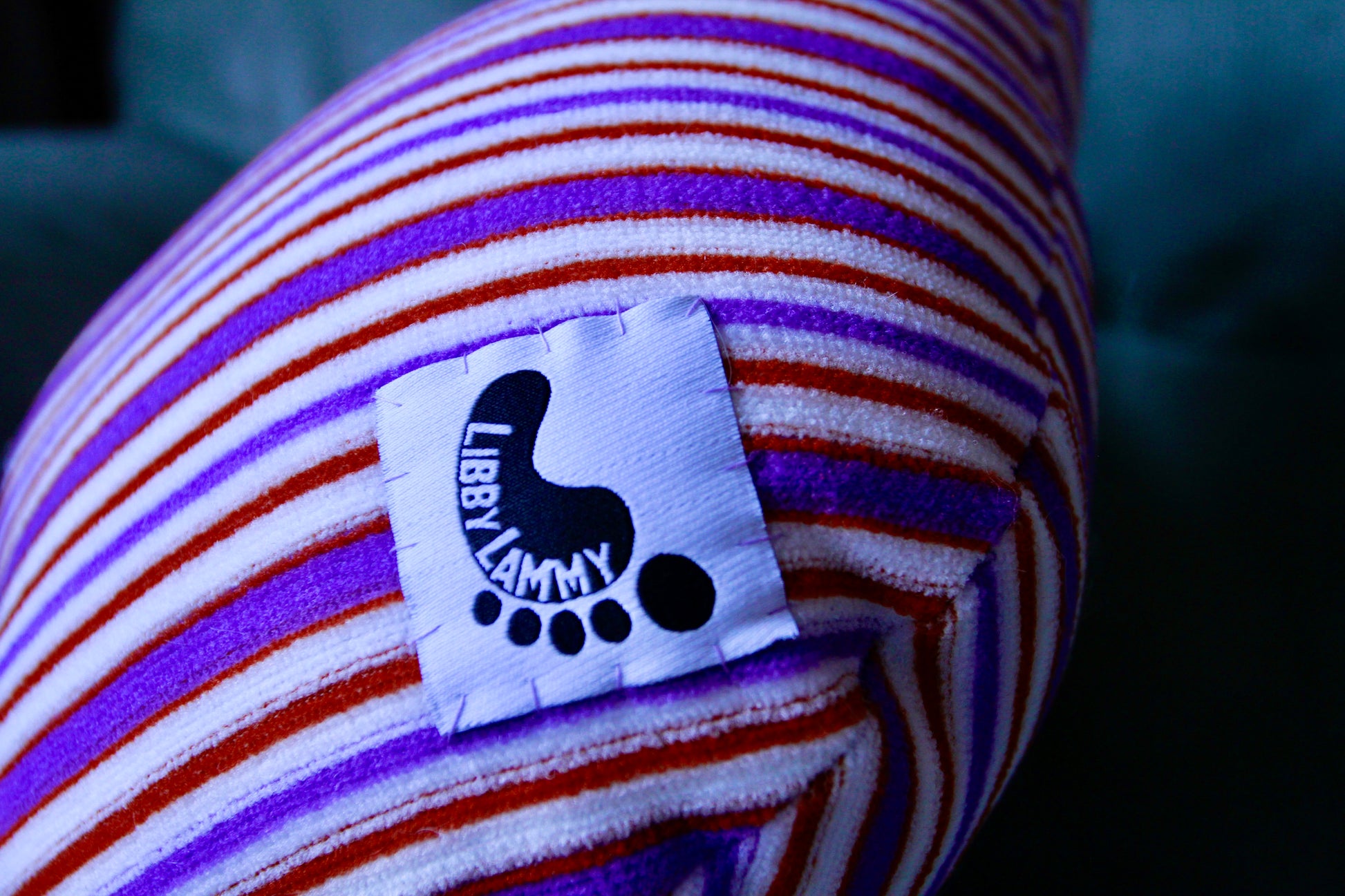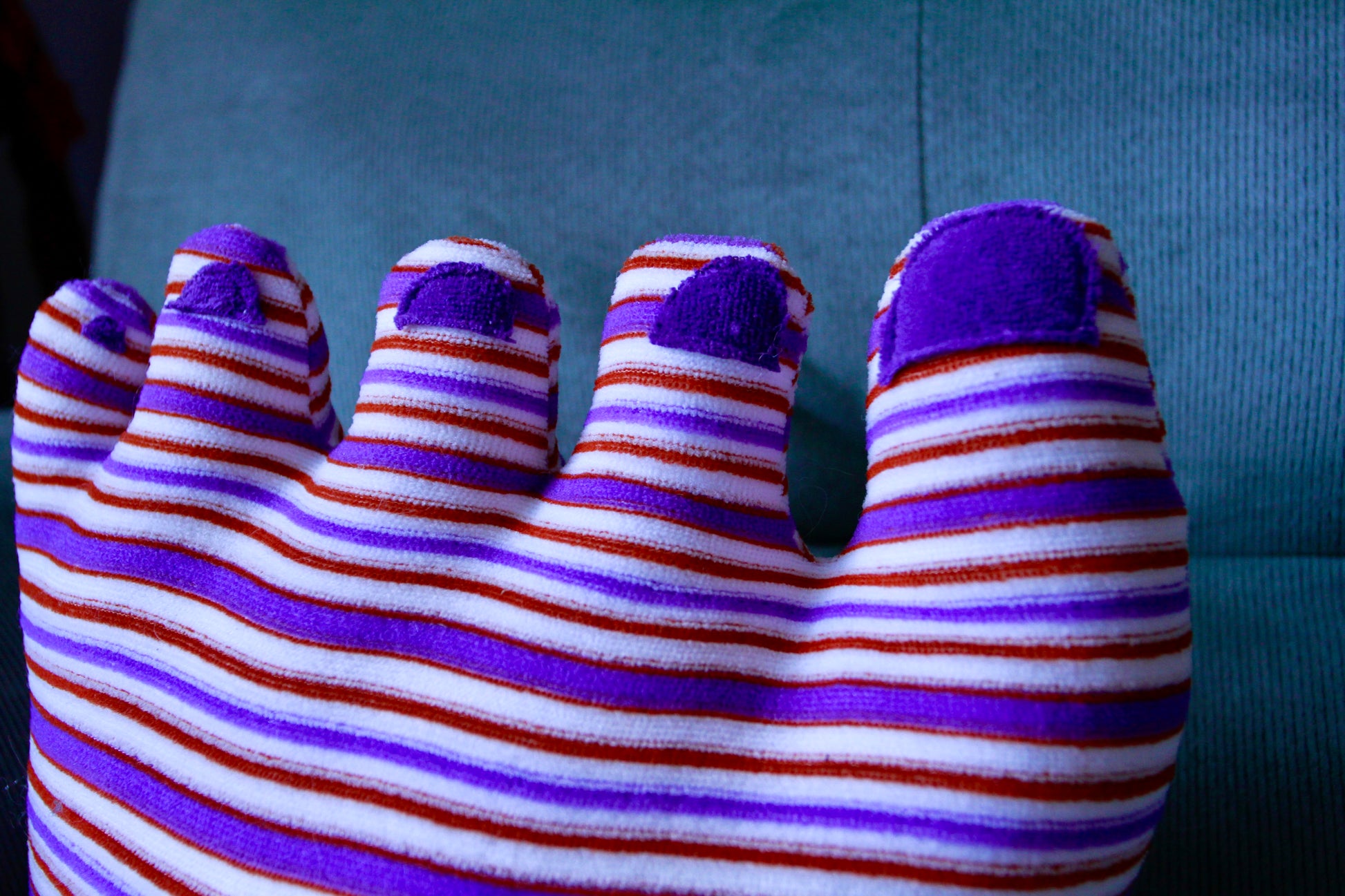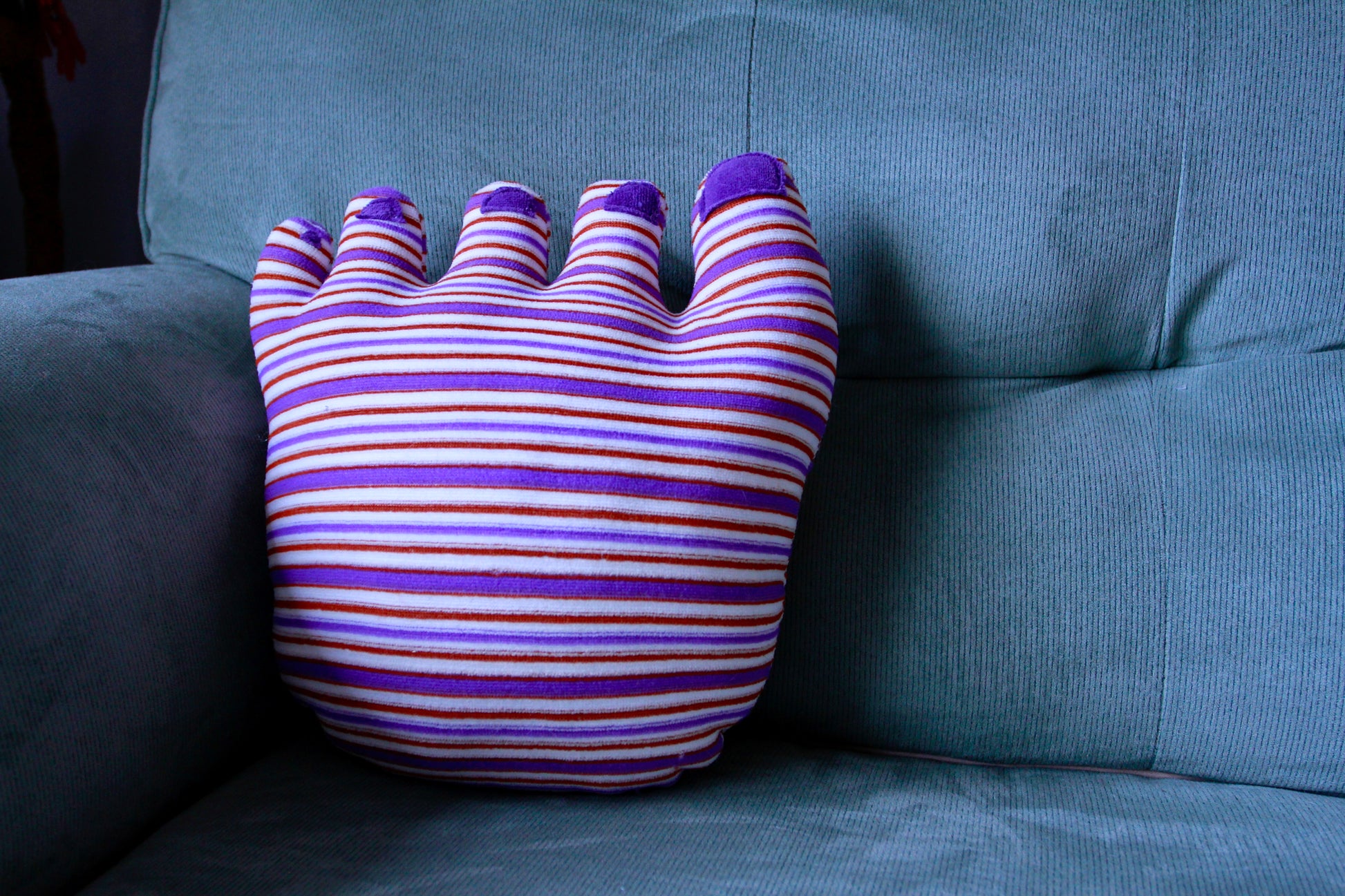 Medium, purple, orange, and white striped foot with purple toe nails and blue/white lace. Sure to brighten up your home and start a fun conversation with your guests.